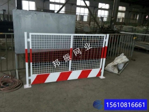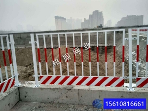 基坑護欄由防護網(wǎng)片和立柱組成。基坑圍擋護欄防護網(wǎng)片由2cm×4cm方管焊接組成,單片尺寸1.1米×1.7米,兩端設(shè)有跨耳用Φ10螺栓與立柱連接固定,跨耳與上下邊緣距離為15cm。